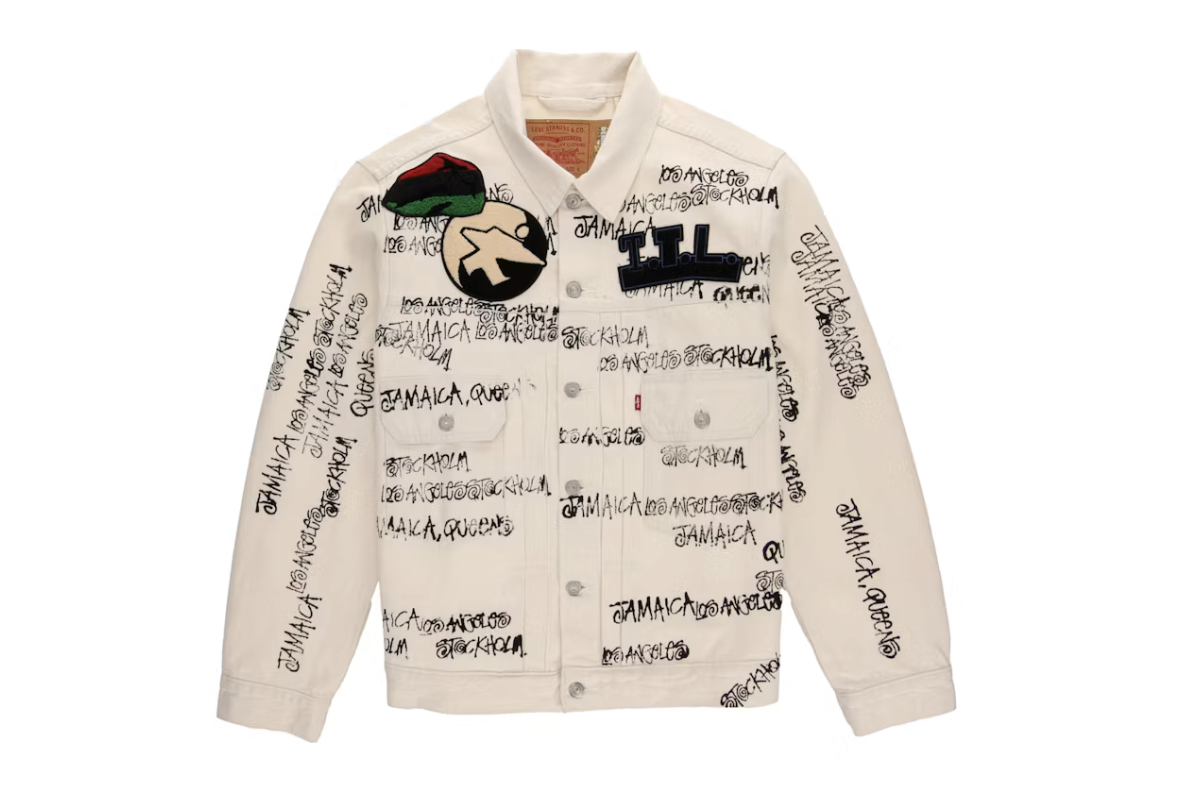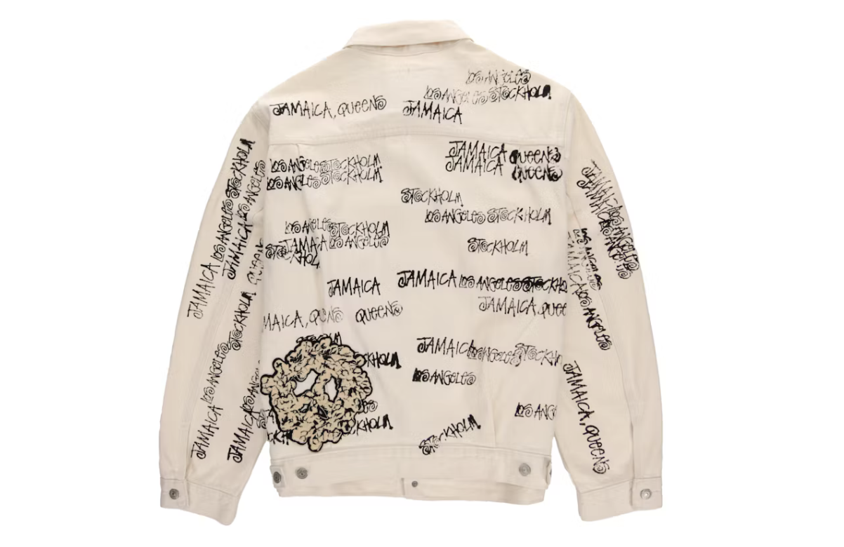 On the Stussy x Our Legacy TTL x Denim Tears jacket, a minuscule logo featuring the green, black, and red colors of Denim Tears appears on the upper right yoke on top of the Surfman Stussy motif. On the right side is an underlined TTL embroidery in black. Above these logos is a fold-down logo adorned by a brown Levi Strauss sewn-on sticker. This jacket features four pockets – two patched flap pockets below the chest and two side seam ones. The cuffs and front closure have a button closure, while the hem has waistband adjustment tabs.